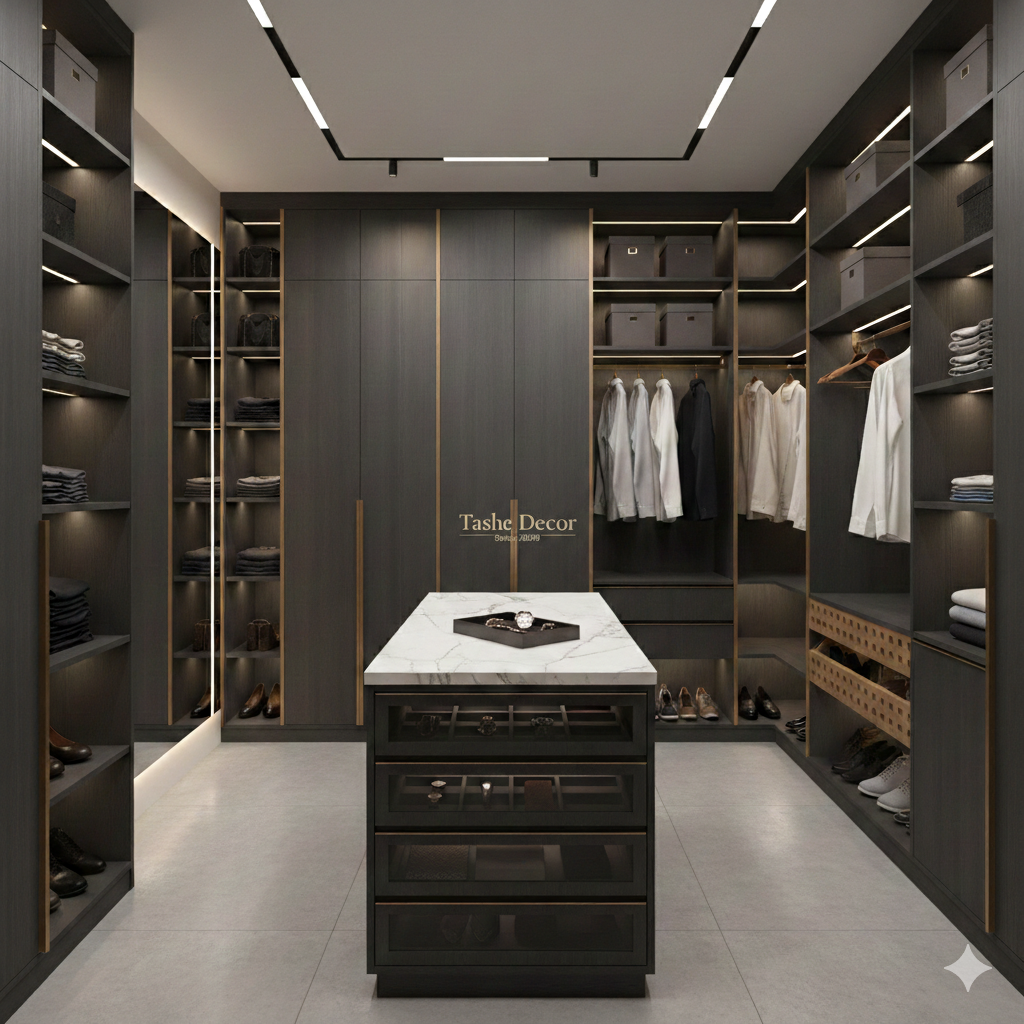 شركة تاشي ديكور (Tashe Decor) معروفة بتقديم حلول ذكية تجمع بين الأناقة العصرية والمعايير الصحية، واستخدام خشب MDF المعالج ضد البكتيريا يعد خياراً مثالياً لغرف الملابس لضمان بيئة نظيفة وآمنة للمقتنيات الشخصية.